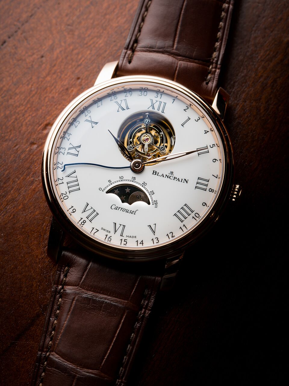 Indicating the date by a hand coming from the center of the dial is called a pointer-date. It is an excellent solution to retain the date function, yet make it less obvious. Perfect when you want to show off other complications, such as the moon phase and the rare carrousel complication on this Blancpain. It is by the way for the very first time that the carrousel and moon phase are integrated into a single wrist watch!