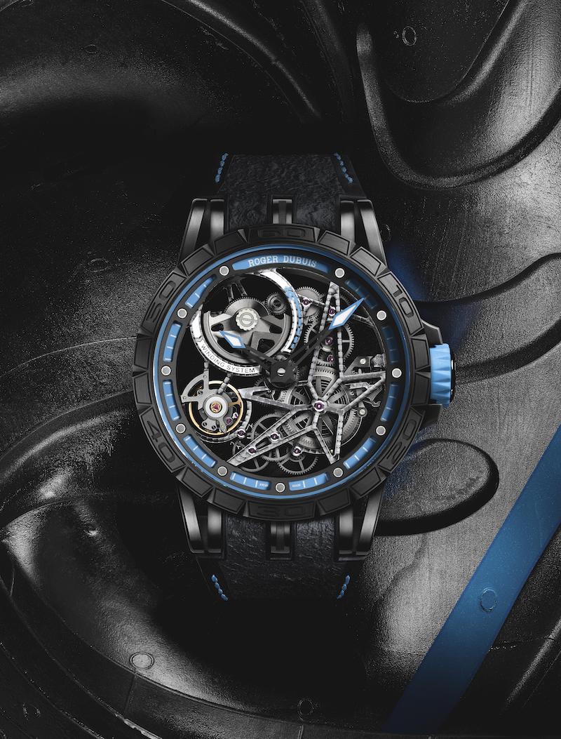 Roger Dubuis adds, of course, their expertise as Haute Horlogerie Manufacture. This comes in the shape of the highly detailed titanium case, which features a coating of Diamond Like Carbon (DLC), which sets the stage for the movement.