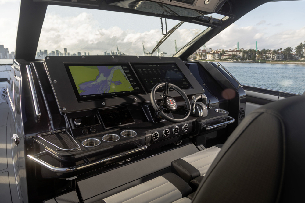 The 59′ Tirranna also impresses with its advanced control-interface design, utilizing a digital switching system, enabling control of various systems from locations throughout the boat and via iPad. The digital system can control everything from lighting at the helm and cabin air conditioners to monitoring of the bilge pumps. There is also an RGB accent lighting system that runs along the gunnels of the boat that can be controlled via an app on the chart plotters. A variety of lighting scenes can be set at the touch of a button. The digital system also decreases the amount of cabling needed in the boat, thus reducing overall weight.