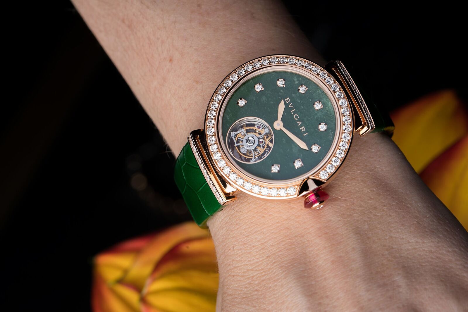 Bulgari gives the tourbillon slightly more room on the center stage of the LVCEA Tourbillon but surrounds it by a precious dial made of jade and set with diamond hour markers. Interesting to note is also that both the Graff as well as the Bulgari have a diameter of 38mm.