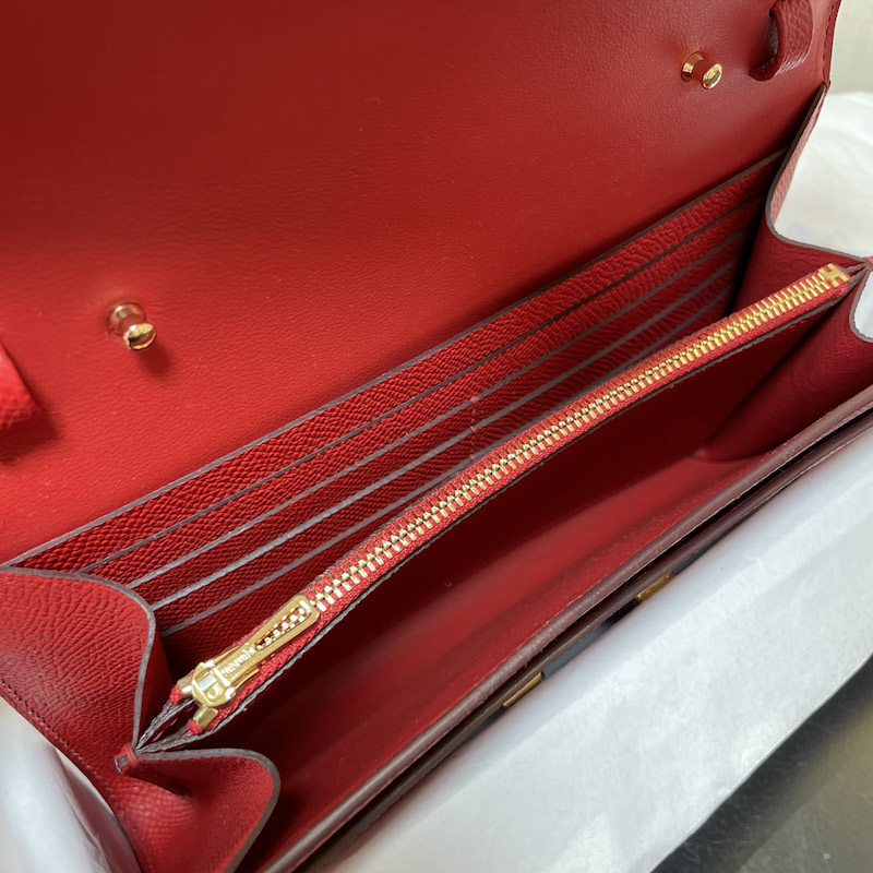 Hermes Constance Long to go wallet in Epsom calfskin with removable shoulder strap, 4 credit card slots, 2 pockets, zipped change purse, exterior pocket and gold-plated 'H' tab closure