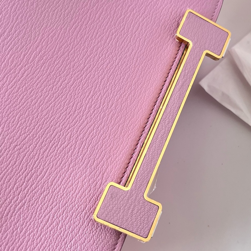 Embrace a cool and edgy vibe with the Hermès Geta. A more casual bag than other Hermès styles, it fills a crucial niche in your wardrobe. It is handcrafted from luxurious Chèvre Mysore goatskin with a grain that softens over time. The bag’s design was inspired by Japanese wooden platform sandals. The chic H closure is repeated on the back. Set low on the bag, the metal hardware is inset with leather matching the bag. The “legs” of the H closure also serve at the bag’s feet, raising the bottom of the bag up off any surface you place it on.