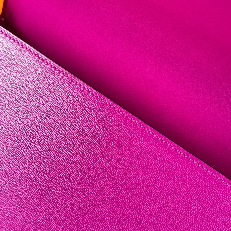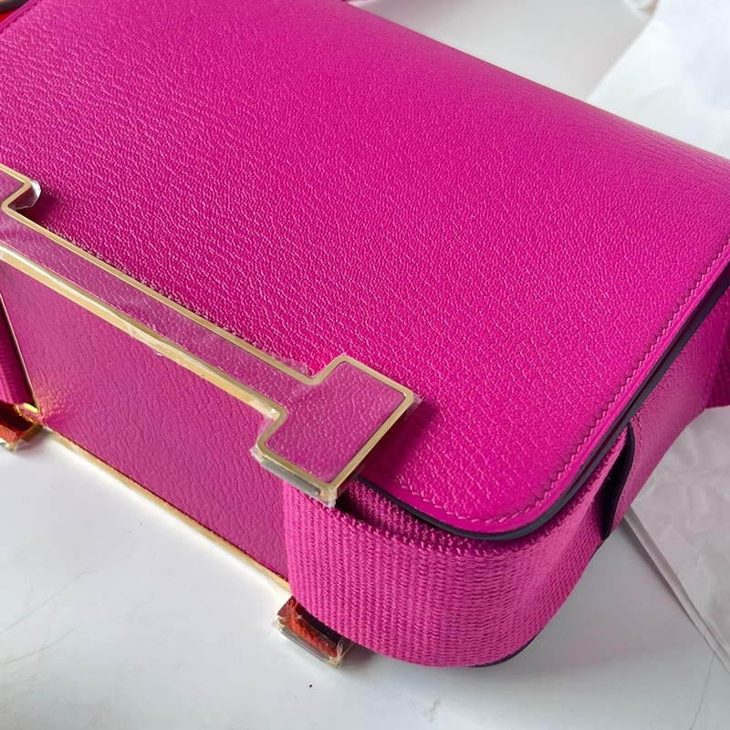Embrace a cool and edgy vibe with the Hermès Geta. A more casual bag than other Hermès styles, it fills a crucial niche in your wardrobe. It is handcrafted from luxurious Chèvre Mysore goatskin with a grain that softens over time. The bag’s design was inspired by Japanese wooden platform sandals. The chic H closure is repeated on the back. Set low on the bag, the metal hardware is inset with leather matching the bag. The “legs” of the H closure also serve at the bag’s feet, raising the bottom of the bag up off any surface you place it on.