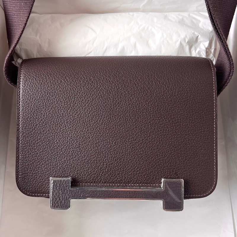 Embrace a cool and edgy vibe with the Hermès Geta. A more casual bag than other Hermès styles, it fills a crucial niche in your wardrobe. It is handcrafted from luxurious Chèvre Mysore goatskin with a grain that softens over time. The bag’s design was inspired by Japanese wooden platform sandals. The chic H closure is repeated on the back. Set low on the bag, the metal hardware is inset with leather matching the bag. The “legs” of the H closure also serve at the bag’s feet, raising the bottom of the bag up off any surface you place it on.