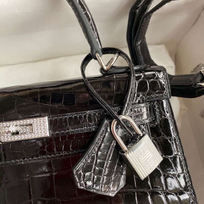 Grace Kelly who used this bag to conceal her pregnancy from the nosy paparazzi, since then the Kelly bag was officially named after her. A very uncommon model - the Diamond kelly is a juggernaut that straddles the line between sculpture, luxury handbag, and an object of fine jewelry. This Shiny Niloticus Crocodile skin comes directly from Africa’s Nile River in a region of Zimbabwe. It is treated to hours of buffing for a glossier and shiny finish.