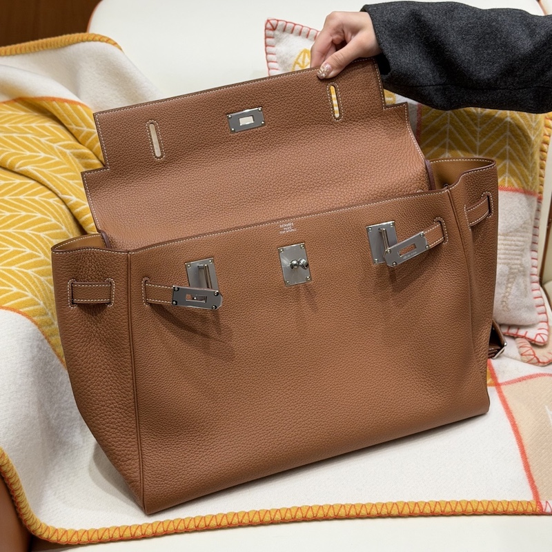 Hermes Kelly 42 Maxi reimagines the iconic silhouette in a bold, oversized format. Designed as a travel companion, it features the signature single handle and adjustable shoulder strap. Crafted from durable canvas or leather, it maintains the classic Kelly turn-lock and clochette while offering generous capacity for weekend getaways.