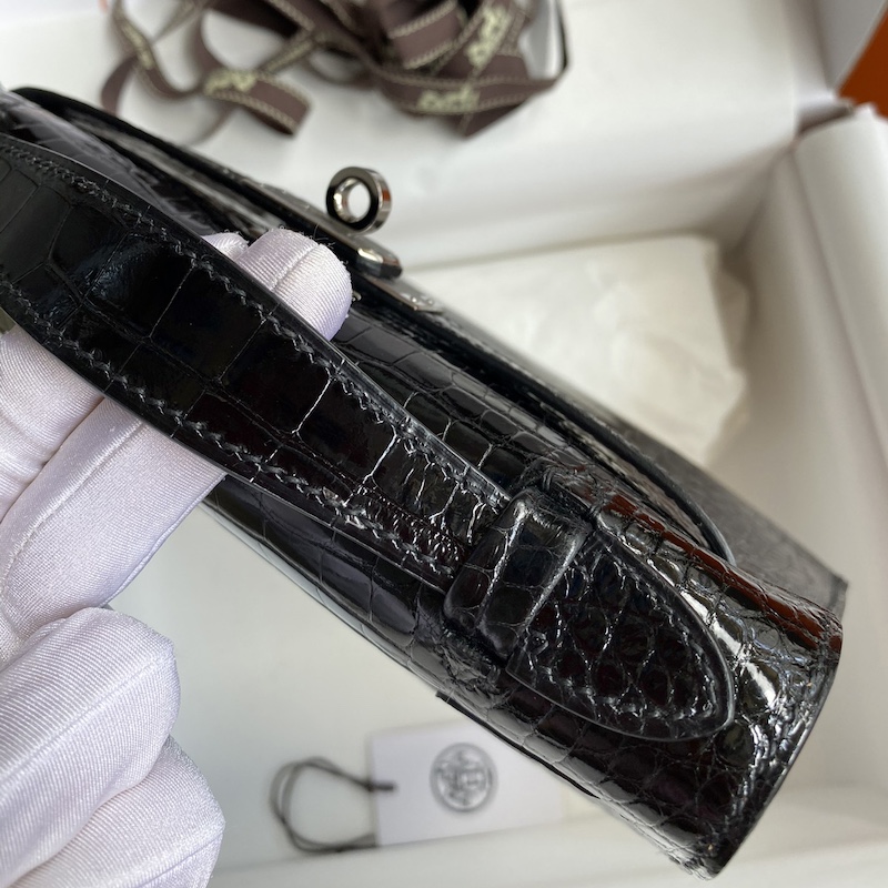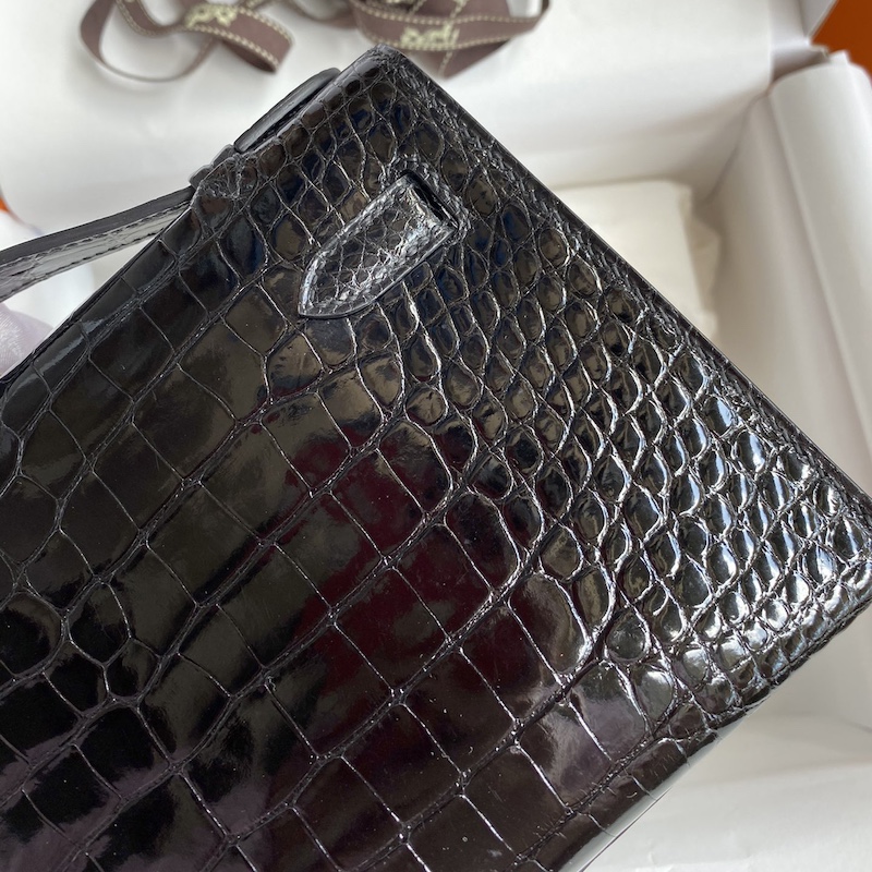 Hermes Mini Kelly Pochette 22cm Bag In Black Shiny Alligator Leather GHW