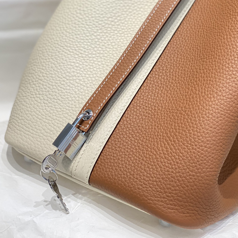 Hermes Picotin Lock 22 Bag named in tribute to the daughter of the designer who introduced it into the collectsions, this leather was developed for luggage and is the ultimate example of a grained leather that has been drummed. This process softens the skin and brings a generous grain to the surface.