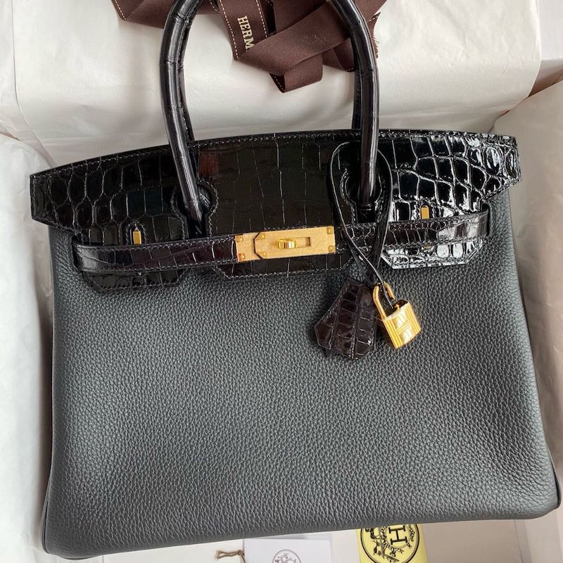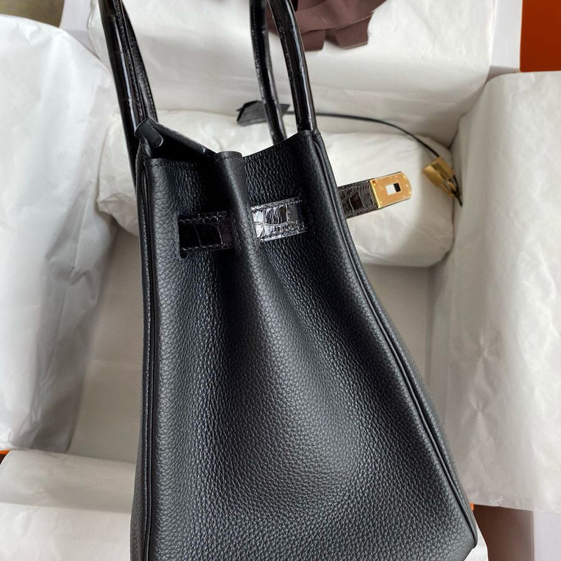 Hermes Touch Replica Handbag Store 30 Bag In Black Clemence and Shiny Niloticus Crocodile Skin