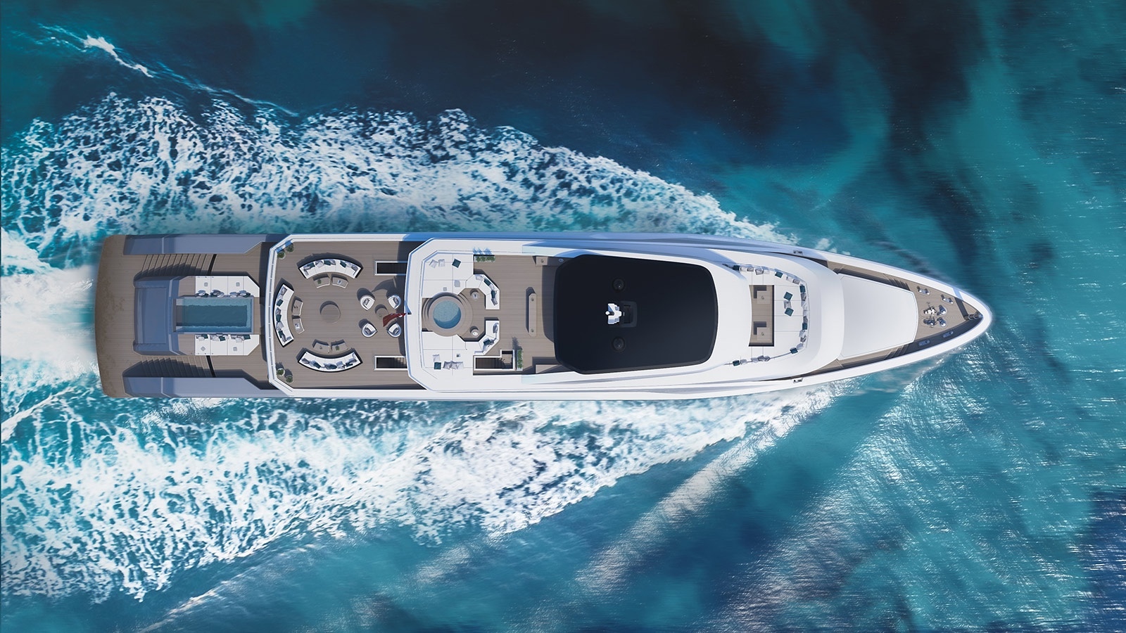 On the stern, there will be a sixteen-foot long infinity pool with adjacent sun pads and a lounge area with two veritable sofas forms the transition to the saloon. Hot Lab proposes for the layout and furniture, a sofa landscape, a bar, a piano and a dining table for a total of 14 people. Floor to ceiling windows cut out in the bulwark will flood the salon with plenty of daylight and will connect the interior with the environment as intense as possible.