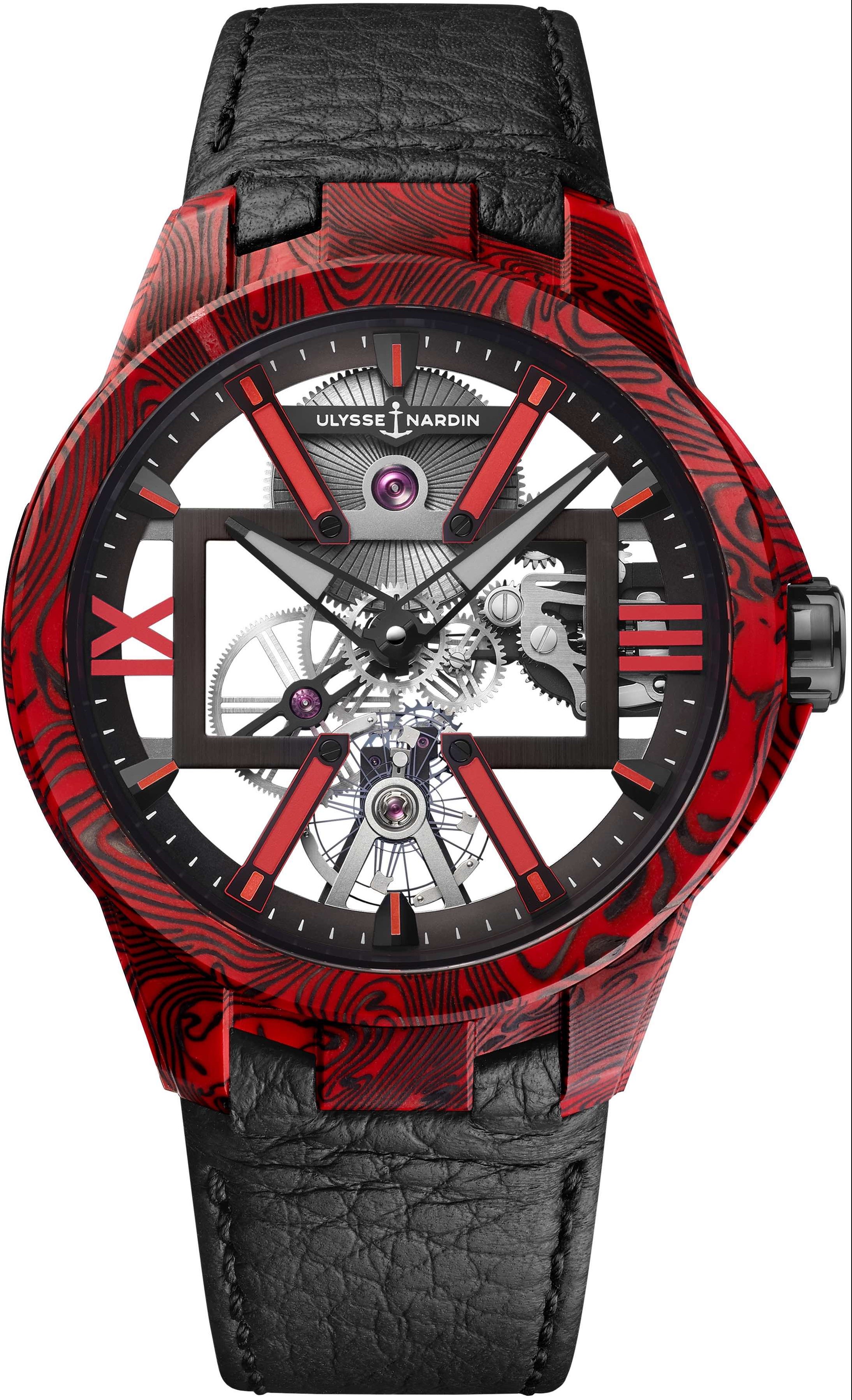 The weekend serves as the perfect launch pad for the new luxury timepiece, given that Haute Living has curated a variety of high-end and bespoke events in the automobile, watch, fashion and culinary industries, highlighting some of the world’s most recognized and celebrated brands. A tour-de-force, the watch is both eye-catching and elegant, combining a head-turning combination of super light carbon fiber and red, marbled epoxy resin, making each timepiece distinct and unique. The “X” shape is created with four indexes, with an inner rectangle and Roman numerals on each side. A black leather strap with black stitch detailing brings everything together in typical, incredibly impressive Ulysse Nardin fashion.