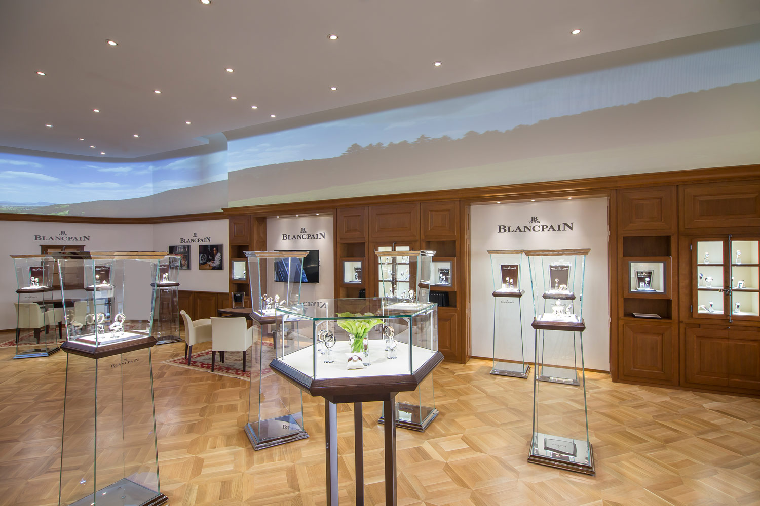 Blancpain’s boutique on Fifth Avenue is the largest one of its kind in the US. It offers a place to explore the brand’s history, as well as its latest offerings. The extensive use of cherry wood is inspired by their workshops in the Swiss town of Le Brassus. Innovative is the 360-degree screening system at the top of the walls, which allows for the display of photo’s and video’s, giving you a unique immersion into the brand’s universe.