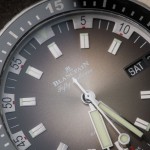 With the Fifty Fathoms Bathyscaphe Day Date 70s Blancpain created a watch that unites modern day technology with the best design elements of the seventies. This is first and foremost evident from the graduated dial that goes from light at the centre of the dial to dark at the edges. Blancpain calls it grey, and although there are most certainly some grey tones present, the dial also seems to have a hint of brown. The result is quite spectacular and goes well with the hour markers and minute indication. The day and date window are for that matter the icing on the cake, as it was in the 1970’s a typical feature on many watches.