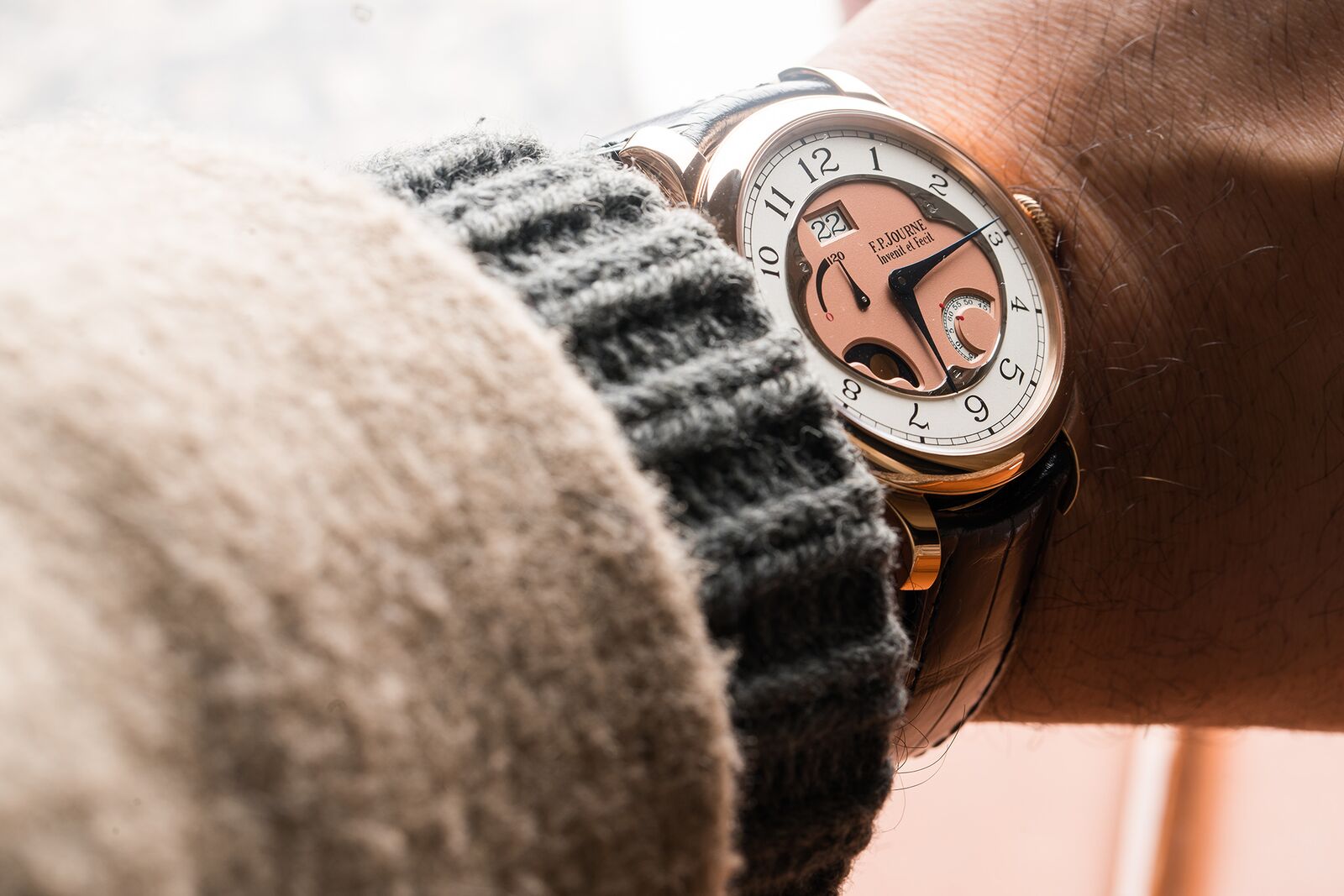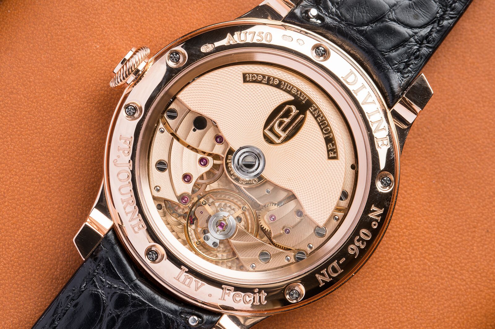 The same goes for the movement. Journe is one of the very, very few that makes the main plate and bridges out of 18k gold. This is exceptionally difficult due to the fact that 18k gold is rather soft. The rotor itself is made out of 22k gold and features unidirectional winding. Thanks to a self-locking system of ceramic ball bearings, even the slightest movement is enough to wind the watch. This makes it rather efficient and contributes that the total power reserve of no-less than five days is reached rather quickly.