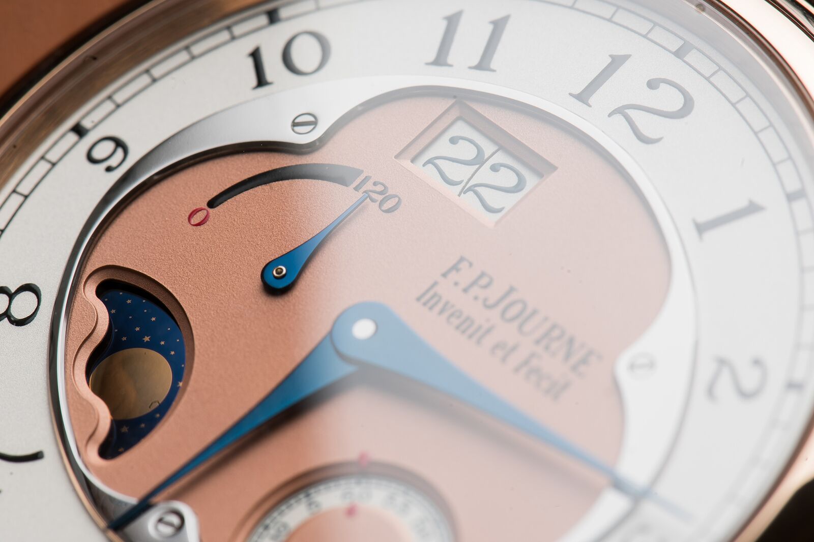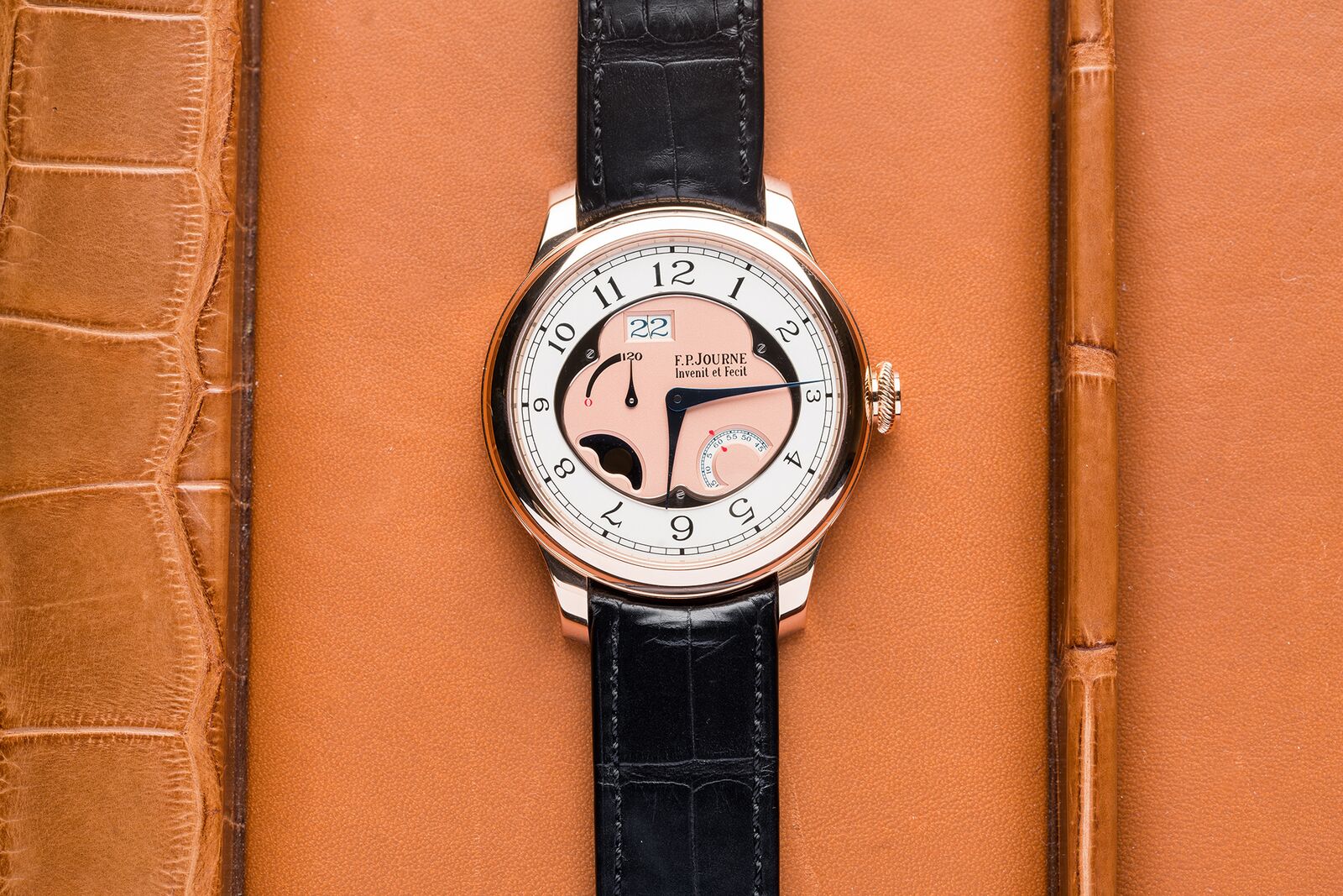 Even at a glance, this watch can only be mistaken for an F.P. Journe, not only because of its elegant case but mainly by its expressive dial. Although very easy to read, Journe distinctly follows his own ideas in what makes a great dial design. The large date resides slightly off centre between eleven and twelve o’clock, and on the other end of the dial, the seconds are indicated by a disc. A moon phase and power reserve indicator complete the functions of the dial, while the hour and minutes are shown by blued hands in a shape typical to Journe.