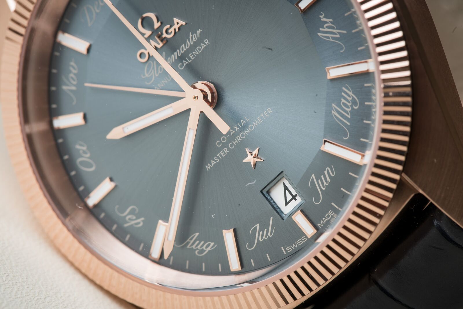 As the Globemaster Annual Calendar is fitted with a so-called ‘pie pan’ dial, Omega cleverly used the twelve facets to display the names on the months, which are indicated by an arrow. The date is displayed in a regular way, by a date window at six o’clock. The result is a very balanced design, yet quite different from other annual calendars in the market.